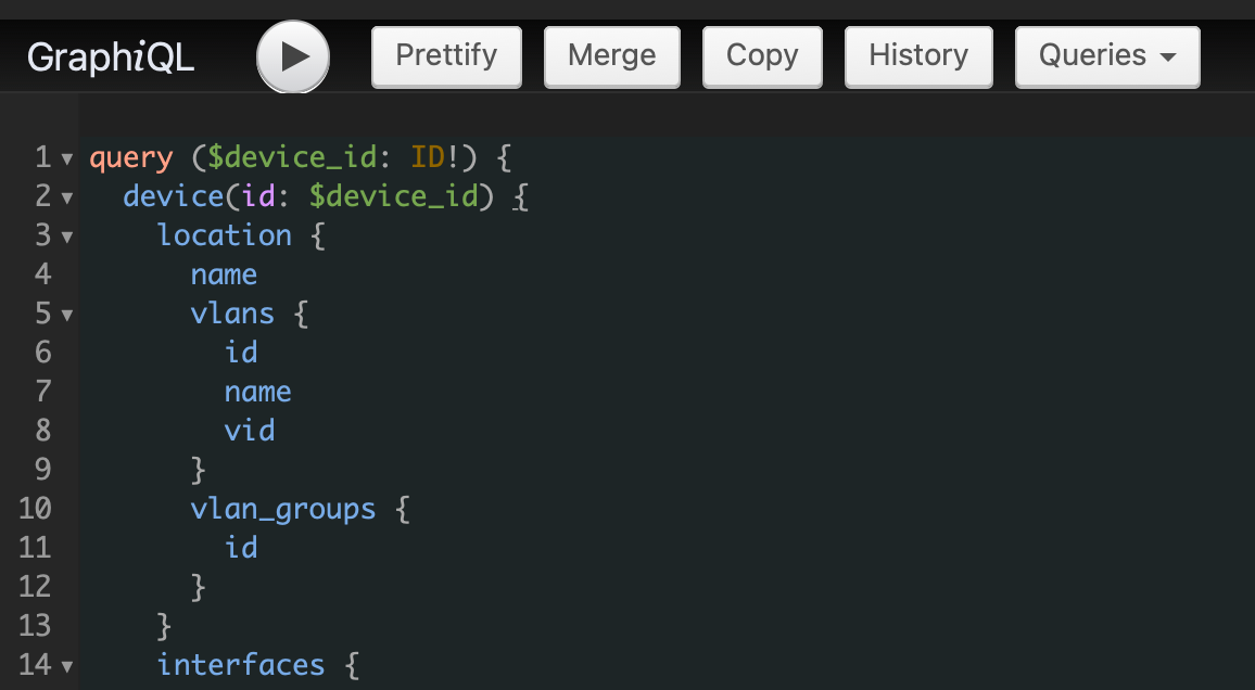 You can see previous queries by clicking on the Queries drop-down, and if you start typing on a new line, it’ll suggest variable names available at that level, starting with the typed letter(s). Hit the play button to execute after you get it how you want it. For per-device queries that start with query ($device_id: ID!) like in the image, you’ll need to supply a “device_id” in the bottom left QUERY VARIABLES frame, so copy/paste one from a valid device in your nautobot instance: