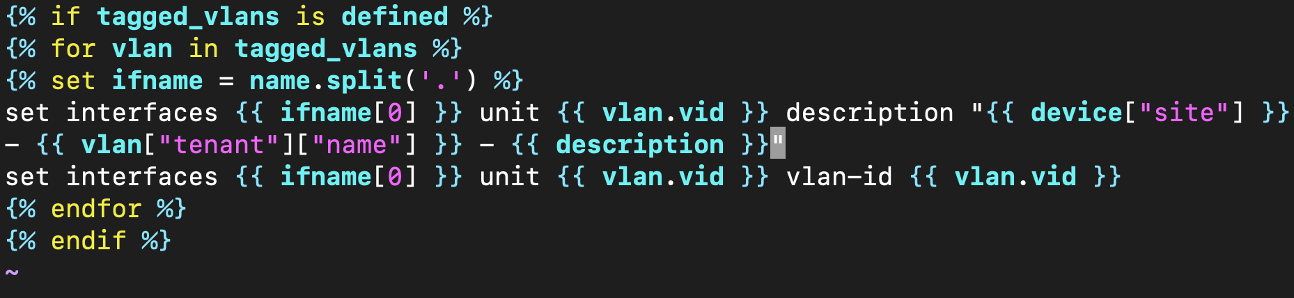 And replaced the hostdata run and printout with template_config. Note that the last line in the function is commented, so that while figuring this stuff out, I’m not actually committing configs on the router, lab or otherwise. Lots of troubleshooting was required to get the templates correct, and in the meantime we can see what rendered config is being sent to the Juniper by logging in and executing show log interactive-commands | match labuser, or whatever $MY_USERNAME is set to.